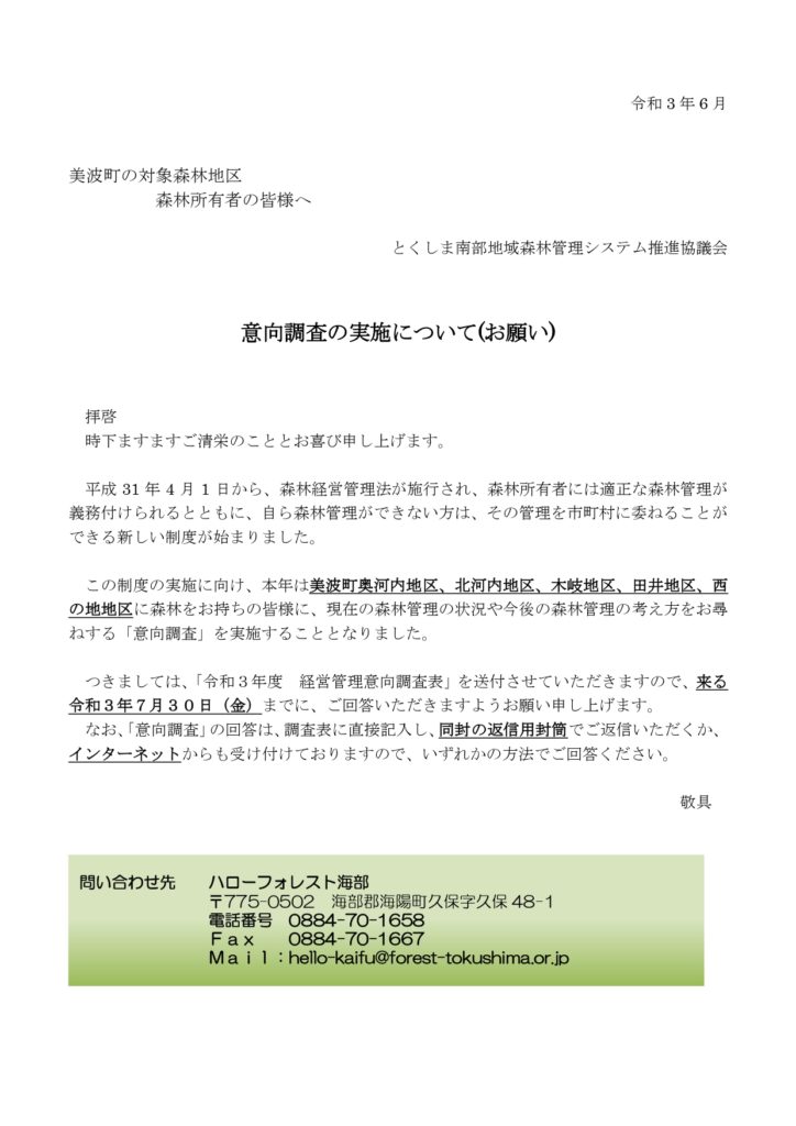 美波町に山林をお持ちの方へ、意向調査票をお送りさせていただきました。
