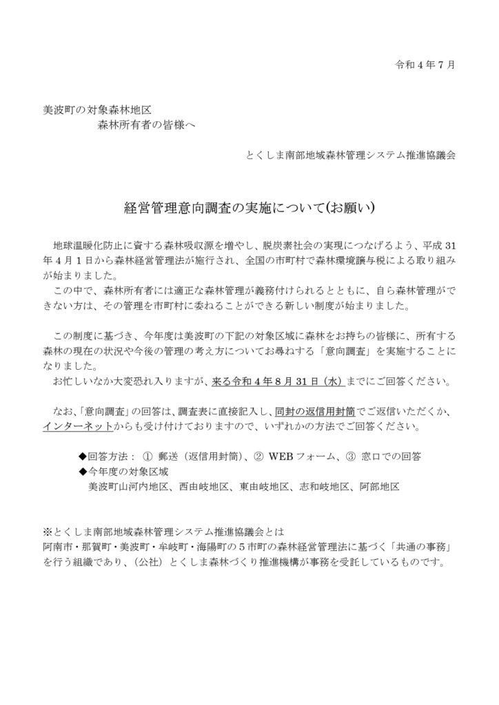 本年度は美波町山河内地区、西由岐地区、東由岐地区、志和岐地区、阿部地区の山林所有者様を対象に意向調査をさせていただきます。